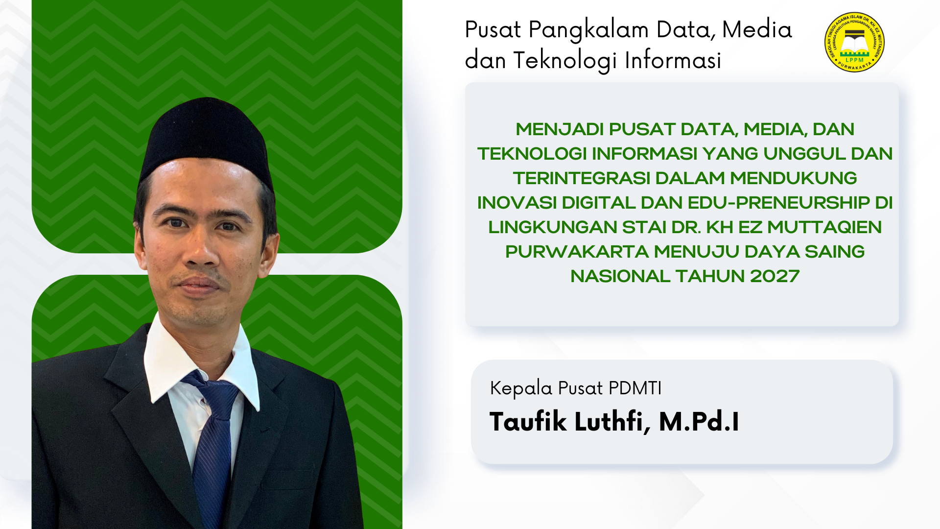 Visi : Menjadi pusat data, media, dan teknologi informasi yang unggul dan terintegrasi dalam mendukung inovasi digital dan Edu-Preneurship di lingkungan STAI Dr. KH EZ Muttaqien Purwakarta menuju daya saing nasional tahun 2027”